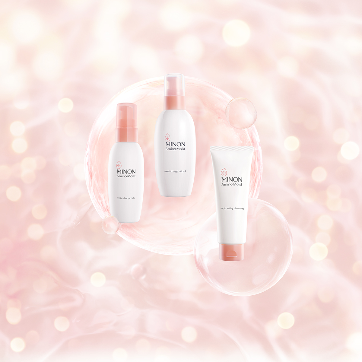 今年のブランドテーマである「貯水肌」を、肌の奥からふっくらと潤いが満ちていく“貯水玉”としてビジュアル化。背景には、このみずみずしい貯水玉がやさしく広がり、ミノンならではの透明感と信頼感を表現しています。